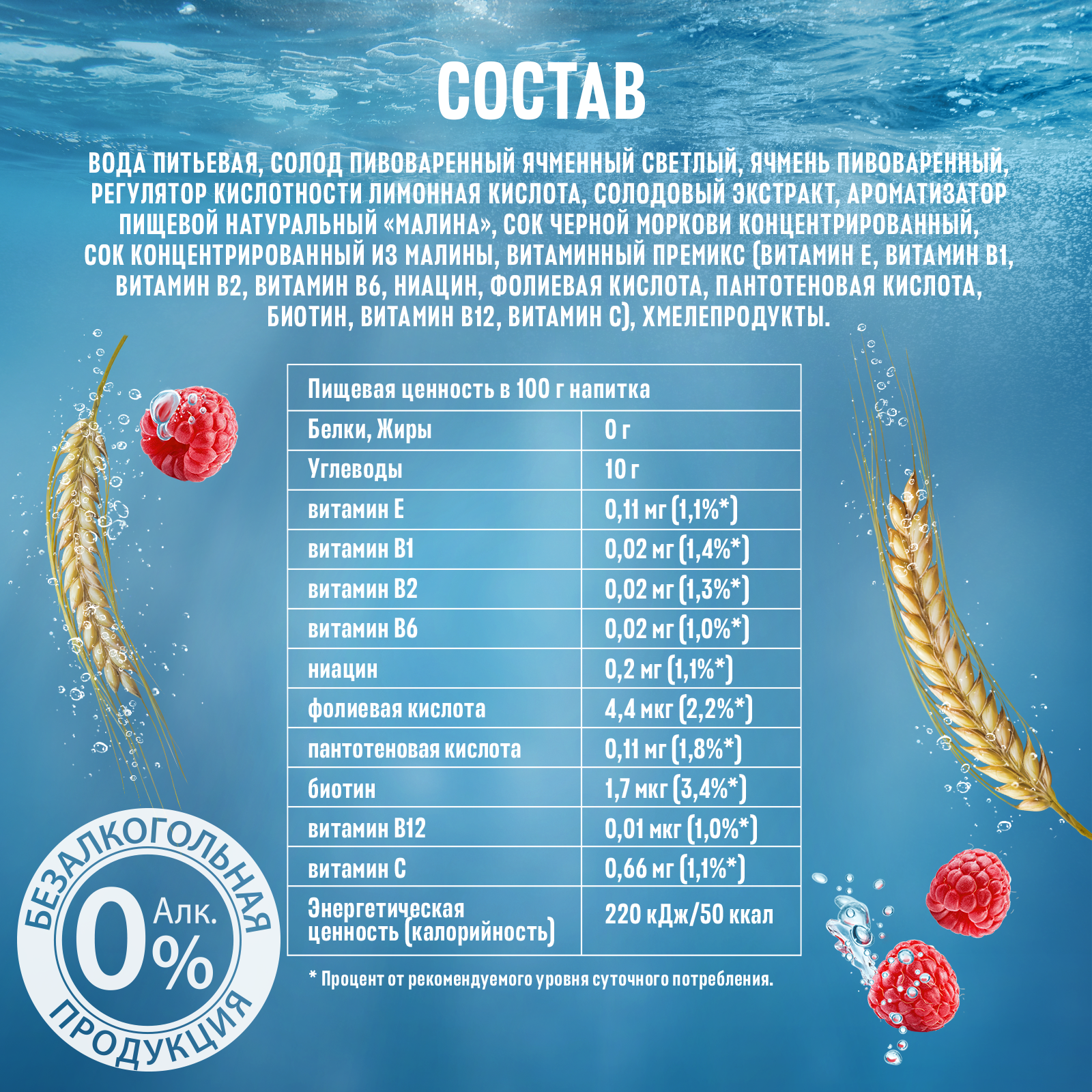 вода питьевая очищенная, солод пивоваренный ячменный светлый, ячмень пивоваренный, сахар, регулятор кислотности лимонная кислота, солодовый экстракт, ароматизатор пищевой натуральный «Малина», сок морковный концентрированный, сок концентрированный из малины, витаминный премикс (витамин Е, витамин В1, витамин В2, витамин В6, ниацин, фолиевая кислота, пантотеновая кислота, биотин, витамин В12, витамин С), хмелепродукты