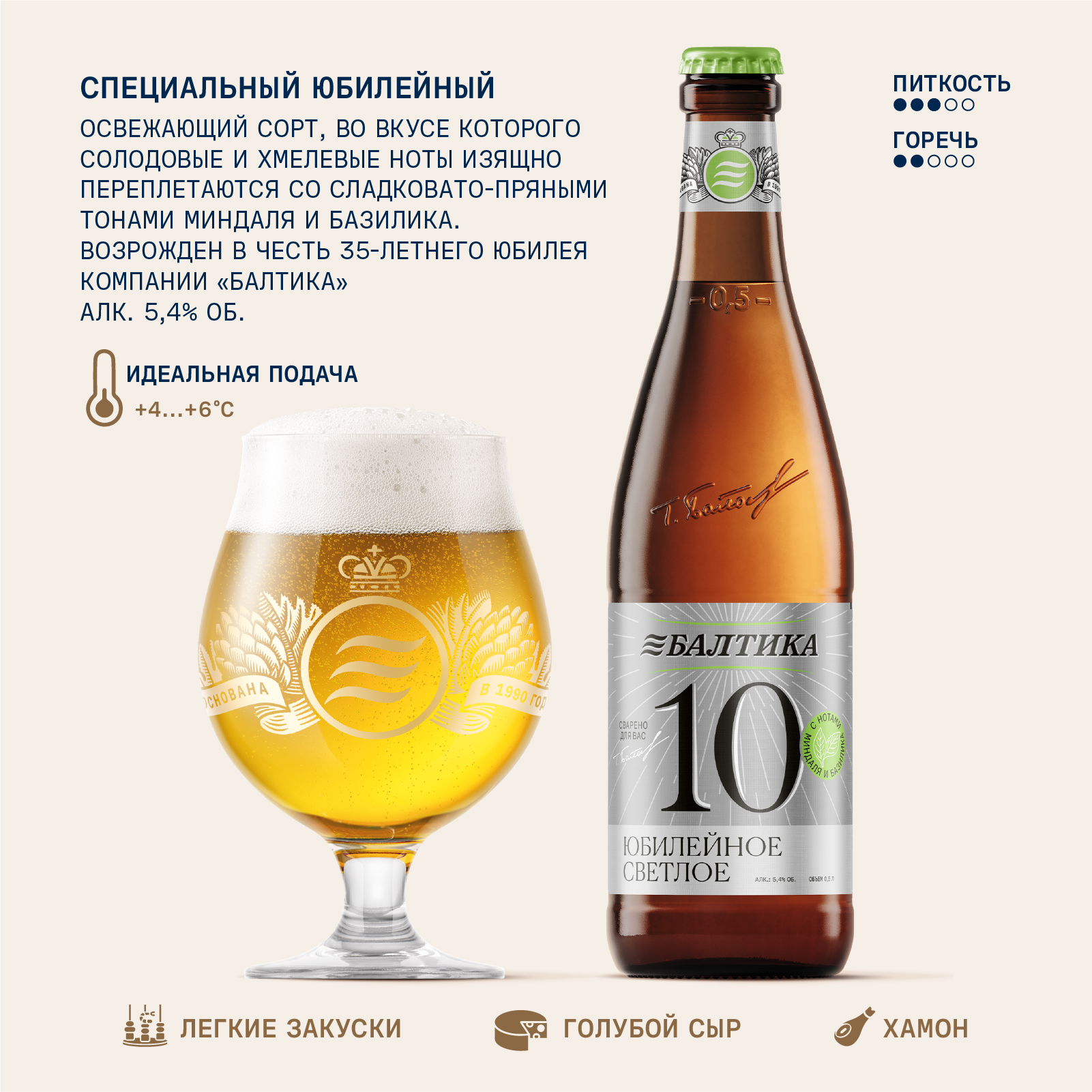 Балтика №10 Юбилейное - достаточно насыщенный и при этом освежающий светлый лагер, во вкусе которого подробнееБалтика №10 Юбилейное - достаточно насыщенный и при этом освежающий светлый лагер, во вкусе которого солодовые и хмелевые ноты изящно переплетаются со сладковато-пряными тонами миндаля и базилика. Сочетание умеренной сладости марципана и свежести базилика в аромате пробуждает аппетит и обещает интересное гастрономическое приключение."