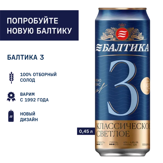 Балтика №3 — это классический светлый лагер, сваренный исключительно из 100% российского солода, подробнееБалтика №3 — это классический светлый лагер, сваренный исключительно из 100% российского солода, который придает пиву насыщенный, глубокий вкус. Ароматный хмель из Чувашии придает пиву яркий хмелевой аромат и выраженную, но приятную горчинку