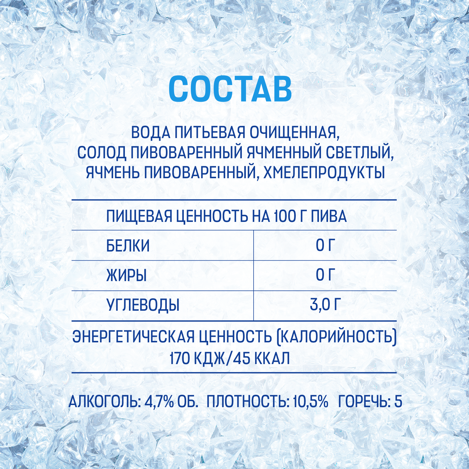 вода питьевая очищенная, солод пивоваренный ячменный светлый, ячмень пивоваренный, хмелепродукты.