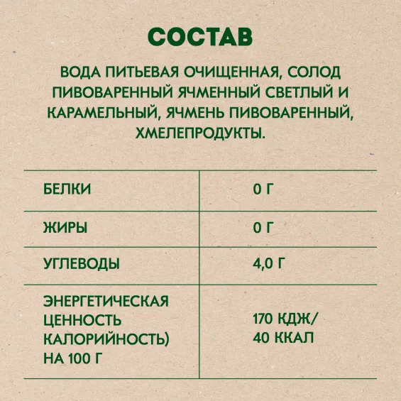 вода питьевая очищенная, солод пивоваренный ячменный светлый и карамельный, ячмень пивоваренный, хмелепродукты