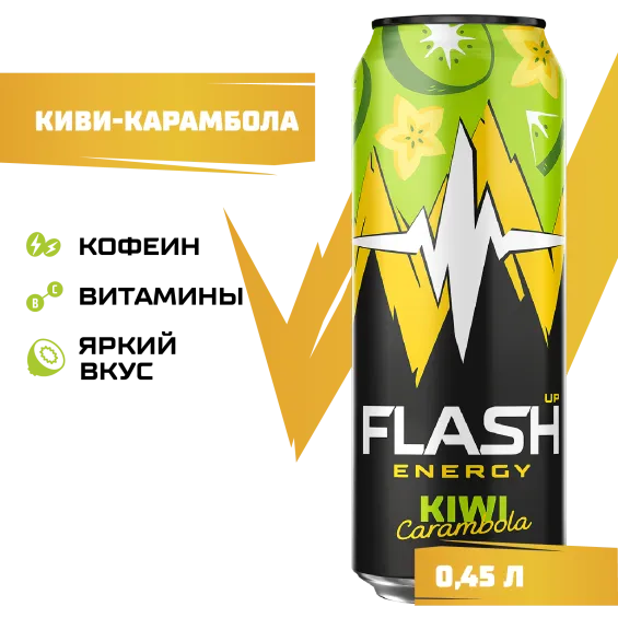 вода питьевая очищенная, сахар, регуляторы кислотности: лимонная кислота и цитрат натрия, концентрат для напитков «Энергия» (таурин, мальтодекстрин, кофеин, ниацин, пантотеновая кислота, витамин B6, фолиевая кислота), комплексная пищевая добавка со вкусом киви и карамболы (ароматизатор, красители: тартразин и синий патентованный), комплексная пищевая добавка «Нейтральная эмульсия» (стабилизаторы: гуммиарабик и E445, терпены, антиокислитель E320), подсластители: ацесульфам калия, цикламат натрия, сахаринат натрия, консерванты: сорбат калия и бензоат натрия