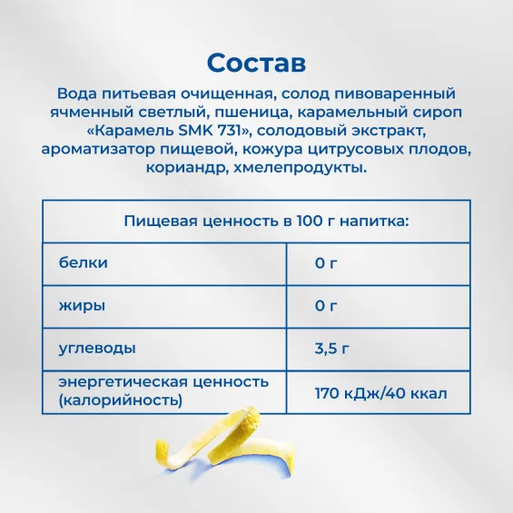вода питьевая очищенная, солод пивоваренный ячменный светлый, пшеница, карамельный сироп «Карамель SMK 731», солодовый экстракт, ароматизатор пищевой, кожура цитрусовых плодов, кориандр, хмелепродукты