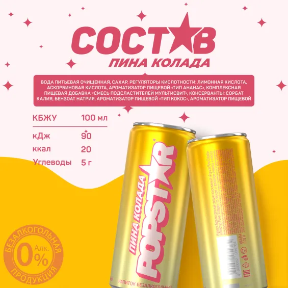 вода питьевая очищенная, сахар, регуляторы кислотности: лимонная кислота, аскорбиновая кислота, ароматизатор пищевой «Тип Ананас» (стабилизаторы: E414, Е445, краситель бета-каротин (Е160а)), комплексная пищевая добавка «Смесь подсластителей Мультисвит» (подсластители: Е952, Е955, Е954), консерванты: сорбат калия, бензоат натрия, ароматизатор пищевой «Тип Кокос», ароматизатор пищевой «Тип Ром».