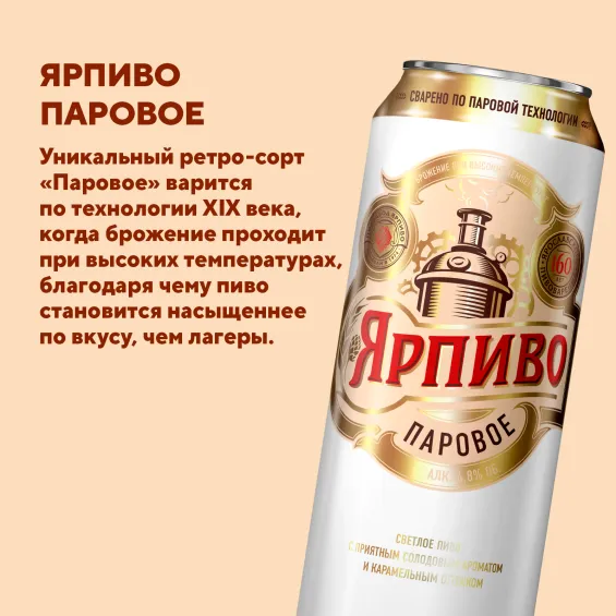 Ярпиво Паровое Банка 0,45 в Воронеже – классическое пиво для повседневного отдыха. Оно сочетает подробнееЯрпиво Паровое Банка 0,45 в Воронеже – классическое пиво для повседневного отдыха. Оно сочетает приятный солодовый вкус и аккуратную хмелевую горчинку, благодаря чему подходит как для самостоятельного употребления, так и в сочетании с закусками. Ярпиво Паровое Банка 0,45 хорошо подходит к мясным блюдам, сырам, снекам и блюдам на гриле. Пиво производится по стандартам пивоваренной компании Балтика с использованием качественных ингредиентов. Купить Ярпиво Паровое Банка 0,45 в Воронеже с самовывозом в фирменном магазине Балтика легко — оформи заказ онлайн и забери его без ожидания доставки.